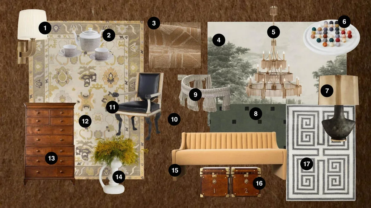 Nicole Roby’s lounge-worthy blend of antique oak, hand-knotted wool and fringed brass